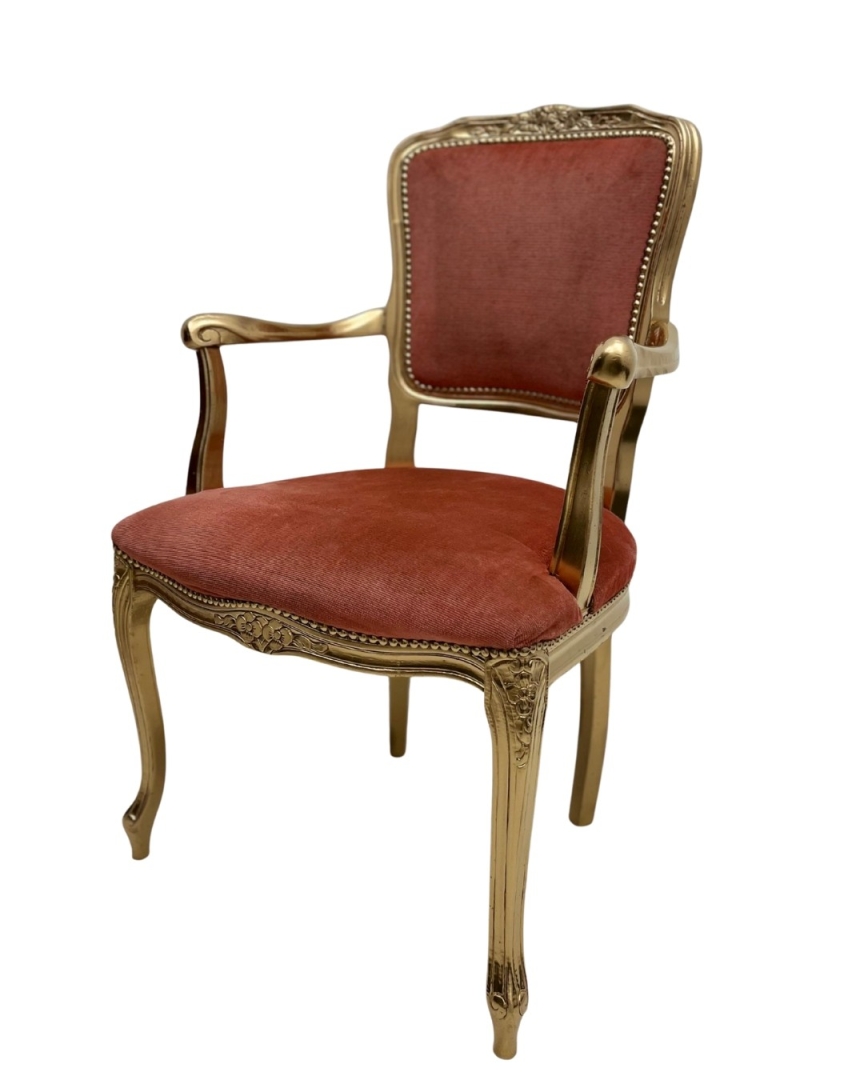 Kleur: fluweel rode stof op een gouden stoel