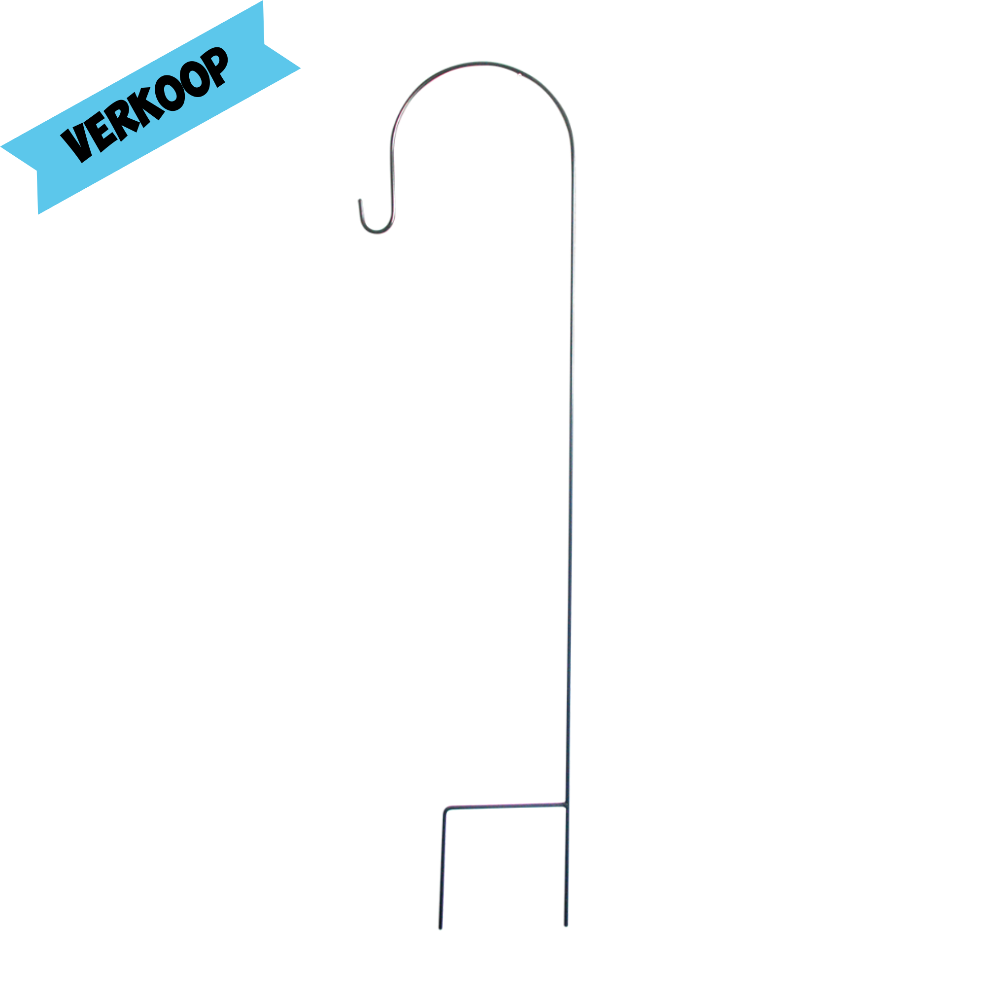 Totale hoogte is 90 cm. Houd er rekening mee dat je bij het in de grond plaatsen al zeker 20cm hoogte verliest. De haak hangt dan nog iets lager dan het hoogste punt waardoor je moet rekenen dat je materiaal kan hangen op 40-60cm van de grond.