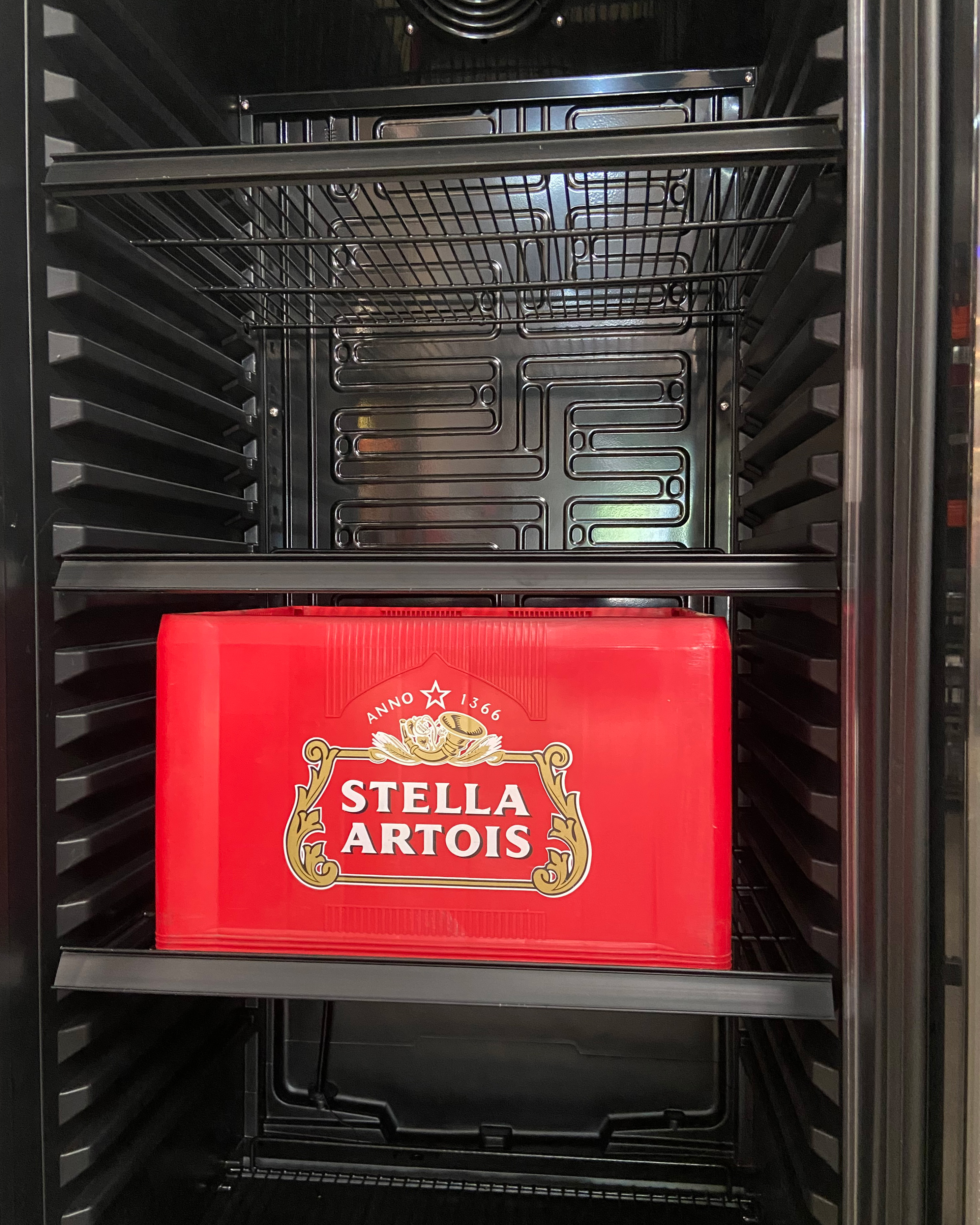 Onze koelkasten zet je in de schaduw. Deze koelkast is onder andere goed om desserts te presenteren. De koelkast zelf is 180cm hoog maar zit in een rolkar waardoor deze makkelijk te verplaatsen is. Hierdoor is de koelkast hoger dan 180cm.