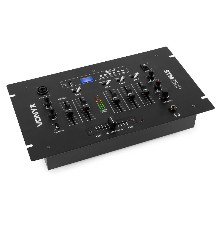 Een eenvoudige mixer waarmee je direct aan de slag kunt is de Vonyx STM2500. Hij beschikt over vijf kanalen waarbij de ingangen worden gevormd door vier lijningangen, twee microfooningangen en twee phono-ingangen. Verder is hij voorzien van een master- en een record-uitgang. Met de ingebouwde mediaspeler kun je MP3-bestanden afspelen via USB en met de Bluetooth-optie vormt streamen van muziek een mogelijkheid. Een koptelefoonaansluiting en een cue-schakelaar om muziek te beluisteren voor de fader maakt tevens onderdeel uit van het geheel. En verder is de STM2500 voorzien van een vervangbare crossfader en een LED VU-meter die je op de hoogte houdt wat betreft het uitgangssignaal.