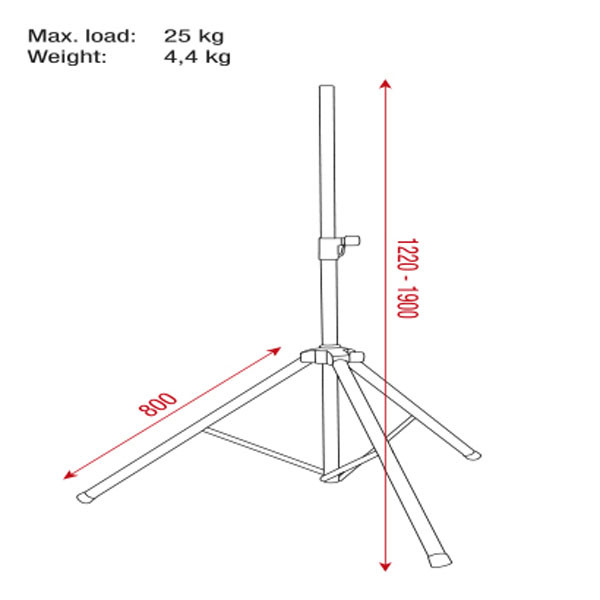 - Dan heb je de mogelijkheid om de middenpaal hoger te plaatsen. Er zijn verschillende 'gaten' in de buis waardoor je kan kiezen op welke hoogte je de paal monteert. Je kan deze fixeren door een pin die meegeleverd wordt en aan het statief vasthangt door het voorziene gat te stoppen. Er is aan het statief ook een draaiknop om het statief te fixeren.