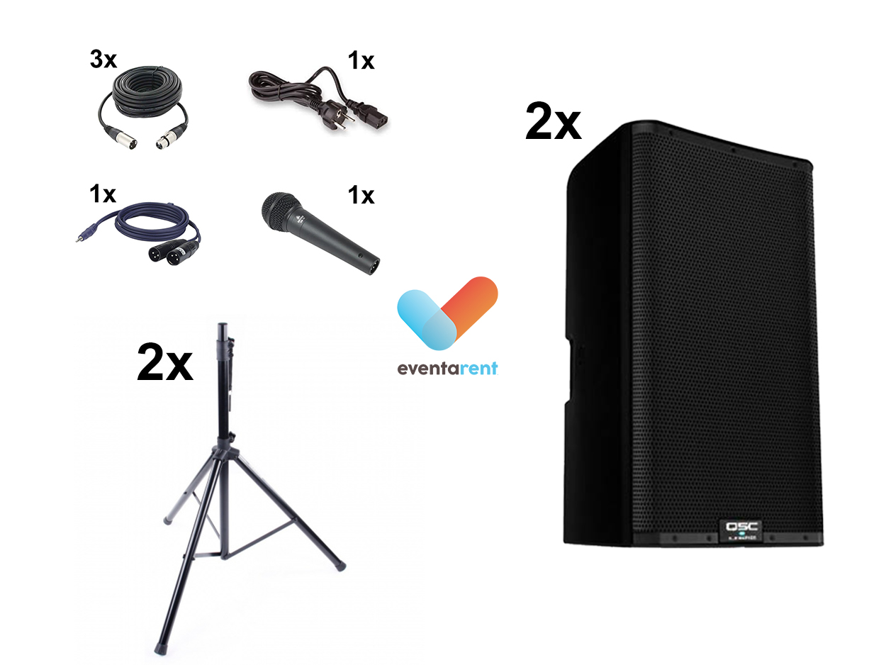 Dit pakket is het meest gehuurde licht- en geluidspakket voor achtergrondmuziek en kleine feestjes. Het bestaat uit een basis muziekinstallatie dewelke bestaat uit 2 professionele en zeer krachtige muziekboxen met statieven en de nodige bekabeling inclusief een micro op statief.