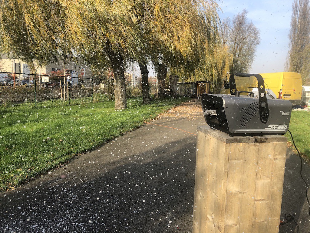 Laten we starten met het gegeven dat onze sneeuwmachines helaas geen echte sneeuw produceren. Sneeuwmachines die gebruikt worden als special effect produceren een soort schuim dat heel erg lijkt op sneeuw. Dit schuim wordt geproduceerd met een speciale sneeuwvloeistof. Deze vloeistof wordt door een ventilator onder hoge druk door een nylonkous geblazen. Op deze manier ontstaat het schuim en wordt het verdeeld zodat er geen grote bult schuim uit de machine komt, maar evenredig verdeelde ‘sneeuwvlokken’.