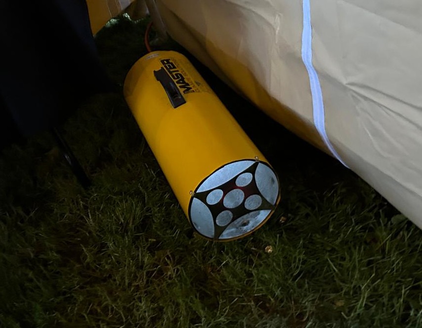 Tip: we raden 1 toestel aan voor 2 tenten van 4x8m tot 5x10m aan elkaar- de nodige verwarming is sterk afhankelijk van type tent, wind, koude, ondergrond,...