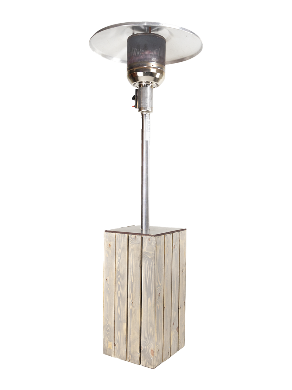 Unieke warmtepaddestoel met houten afwerking. De gasfles kan bijbesteld worden.